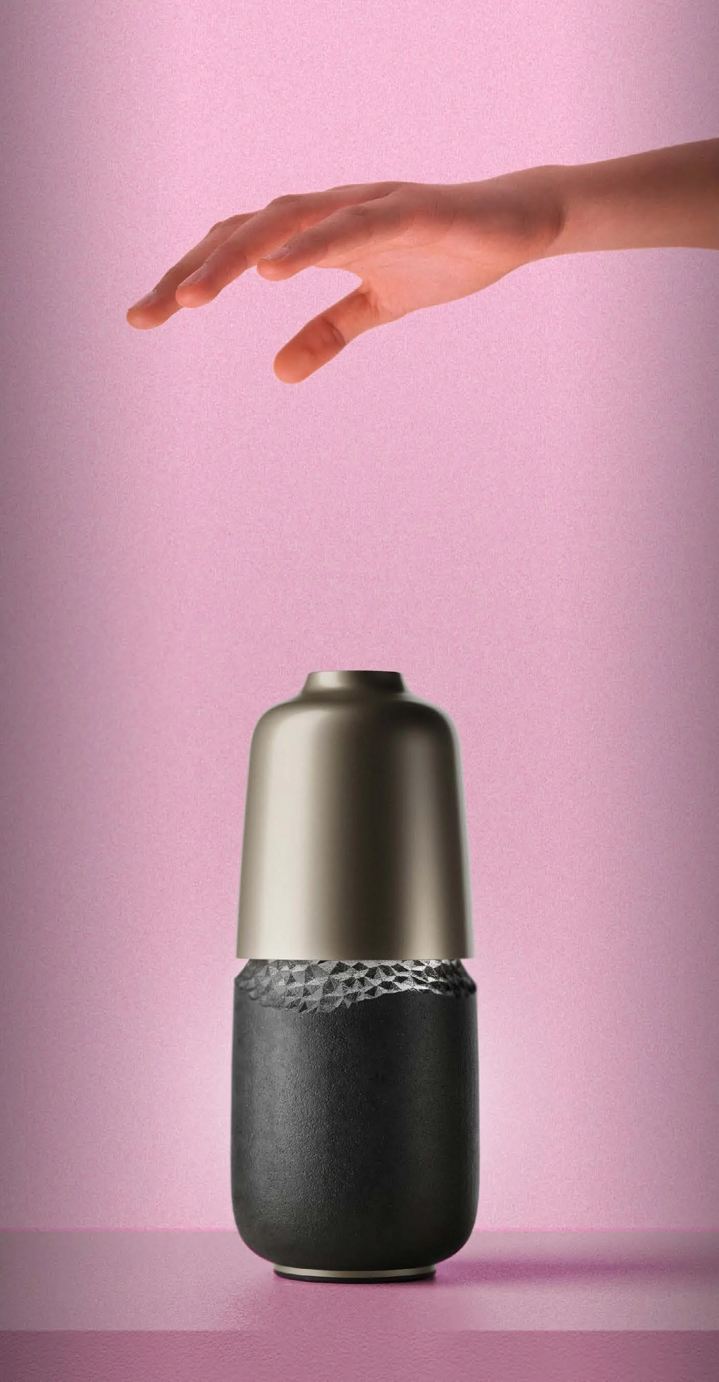 Simply hover your hand over B, and “push” down onto air to turn the light on. The more you push, the brighter the light glows. The bottom diffuser housing can be swapped for different modules, each resulting in a unique lighting effect.