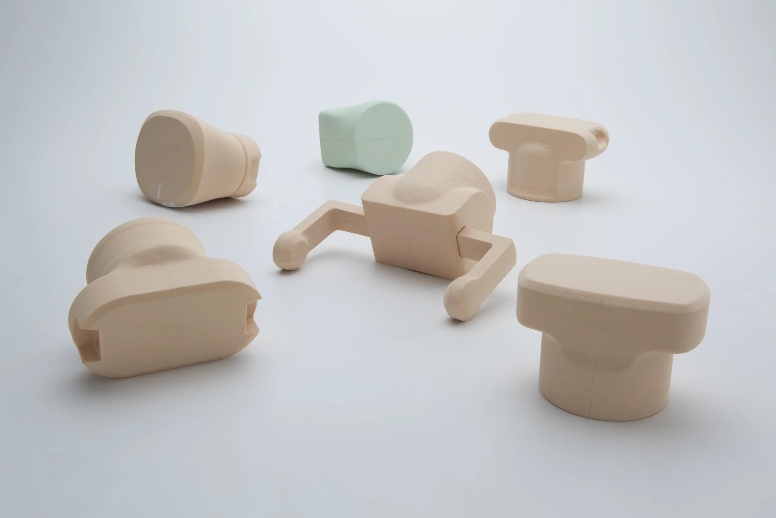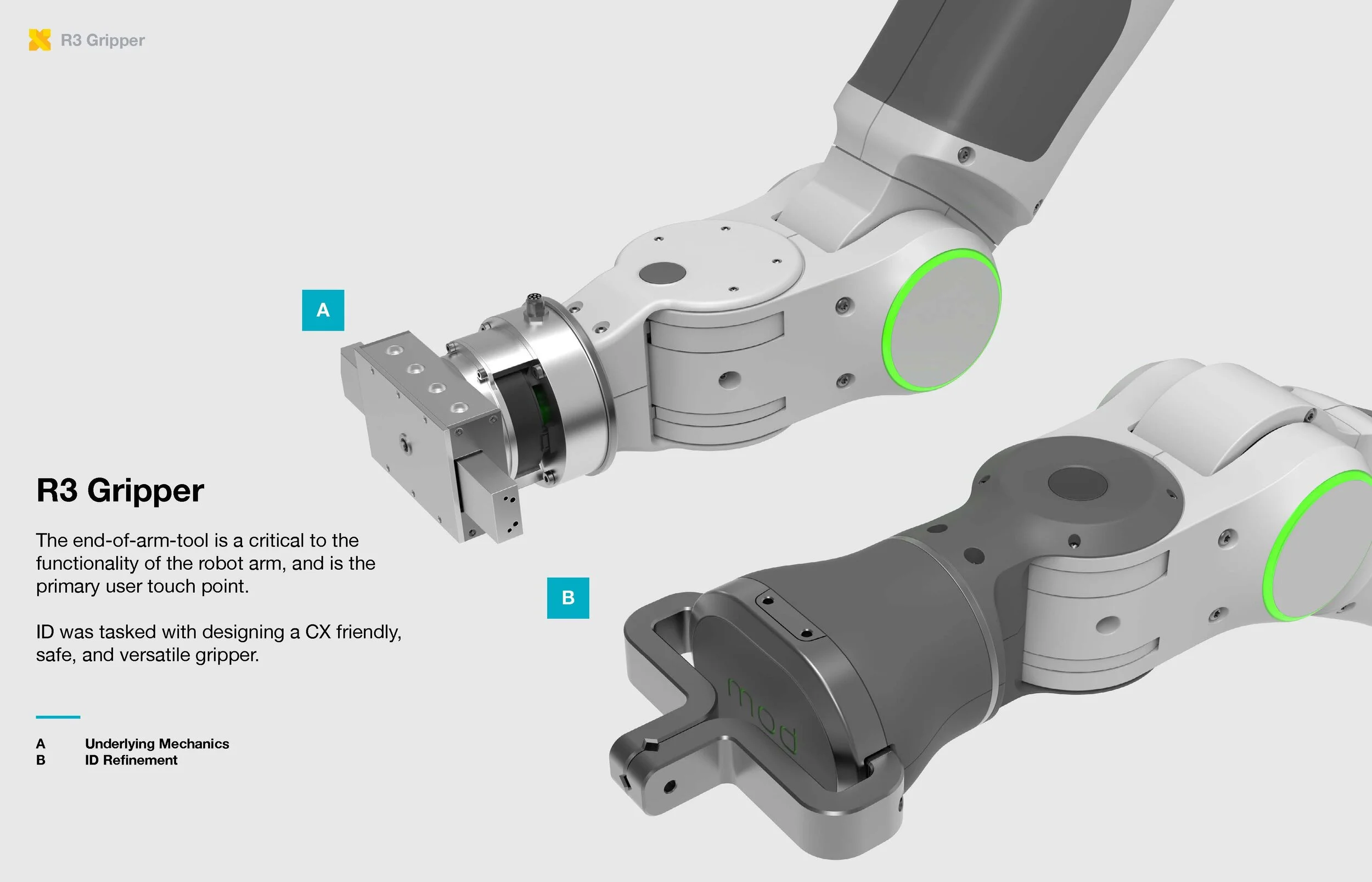 The end-of-arm-tool was intended to provide an ergonomic touch point for users to reposition and program the R3. The large dished feature along the wrist joint would allow “blind” locating of the way-point button. To augment the gripper, users could design their own end-of-arm attachments, such as a cake icer, and affix them to the screw-points along the top and bottom of the gripper. Users could also replace digits with wider or narrower fingers. Proper gaps along the device surfaces would ensure pinch-point and physical safety hazard mitigation.